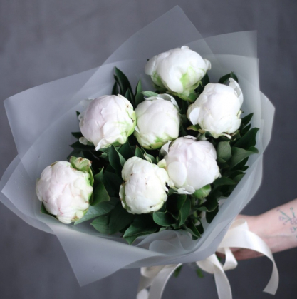 Букет из 7 белых пионов "Дюшес" с доставкой в Колпино