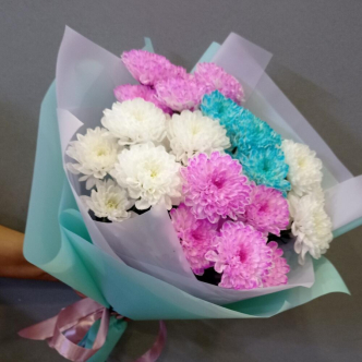 Пышный букет из красных роз и белых кустовых хризантем станет незабываемым подарком для любимой девушки.